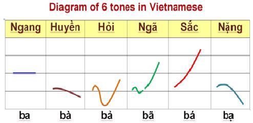 - Tone system (6 tones): Vietnamese is a tonal language, so a single syllable can have different meanings depending on the tone. This doesn’t always map cleanly into non-tonal languages like English.